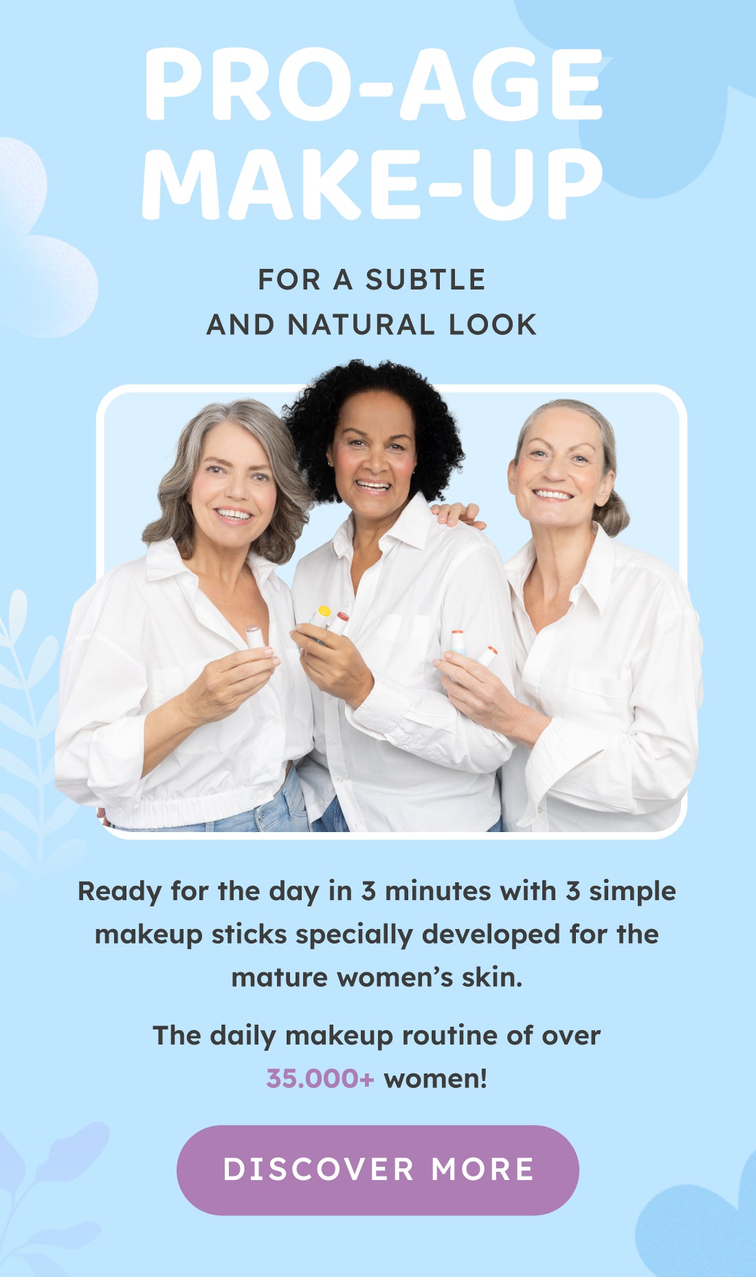 Our mission is to give 45+ women more self-confidence by making you shine naturally within 3 minutes. We do this with multifunctional make-up products that are made on a cream base.